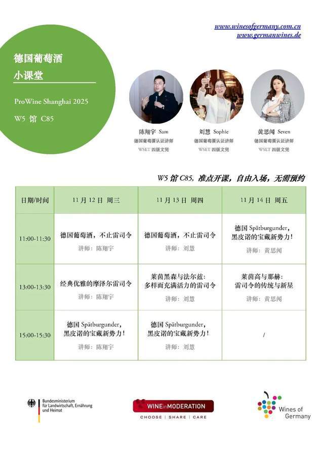 展会三日,在德国葡萄酒国家展团内(展位号 W5C85),德国葡萄酒协会特邀三位认证讲师,德国葡萄酒小课堂每日开课,每节课程时长30分钟,内容精简主题鲜明,自由入场无需预约。